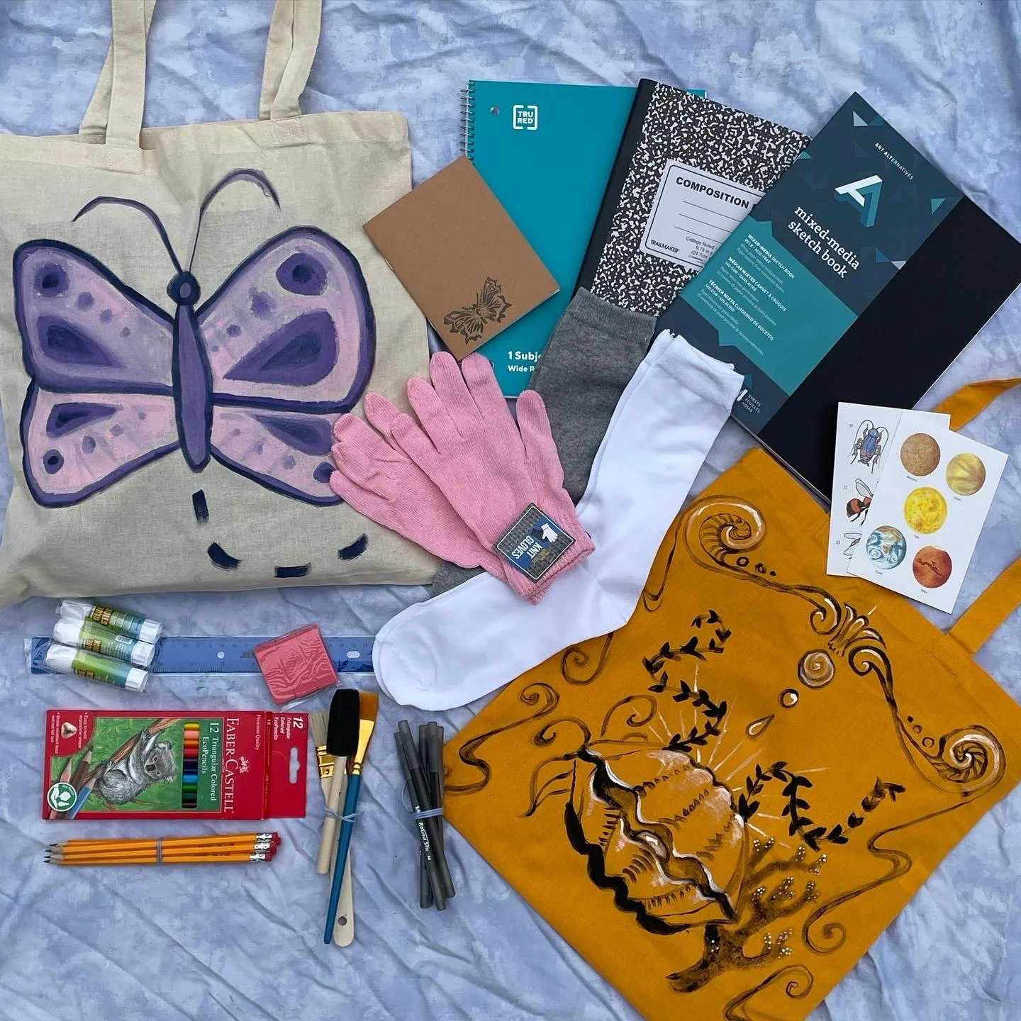 In the winter of 2020 in to 2021 we were able to hand paint and fill 100 bags with school essentials and creative extras to support students passionate brain and create a resource for students during second semester and parents during the Holiday Season.
